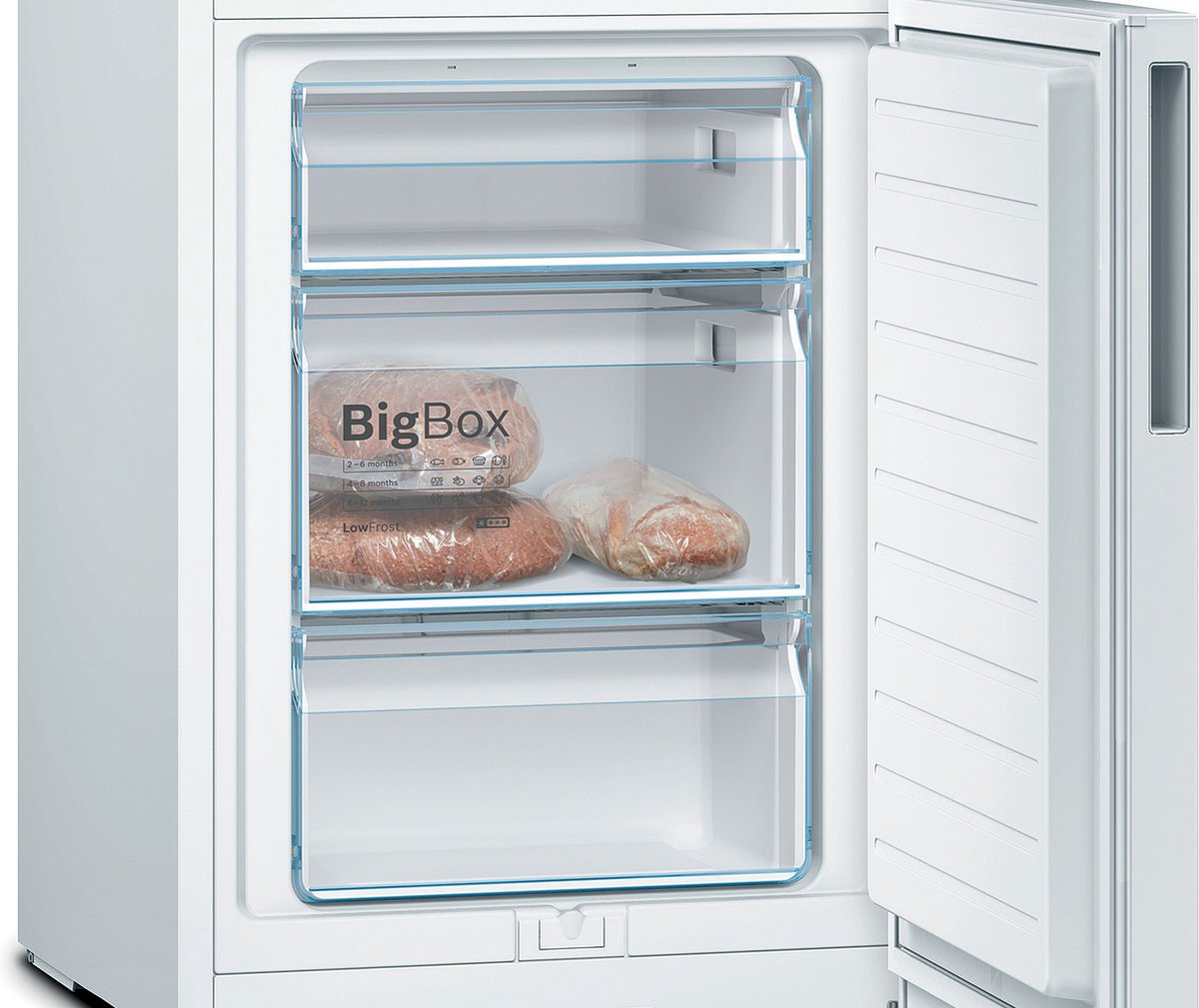 In de vriesruimte bevindt zich een bigBox-lade. Deze lade is perfect voor het invriezen van grotere producten. Denk hierbij aan een stapel pizza’s, ijsdozen of een grote taart.