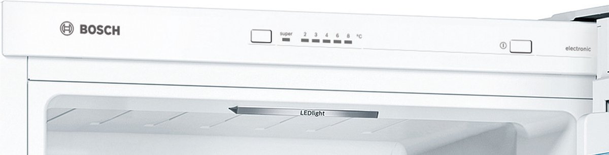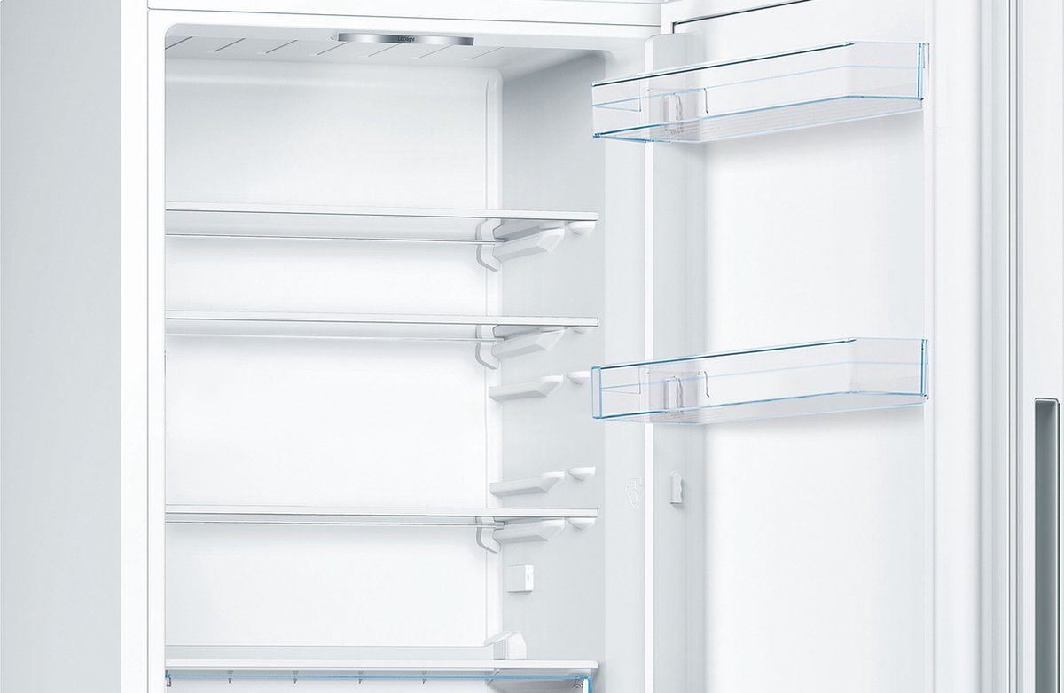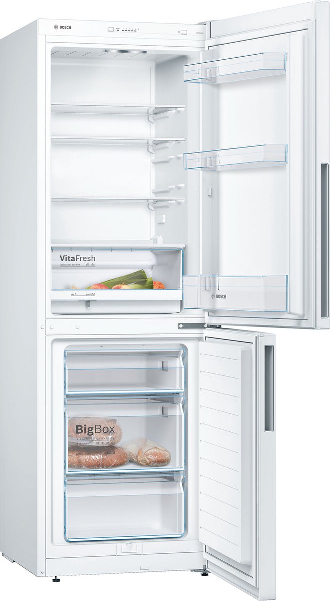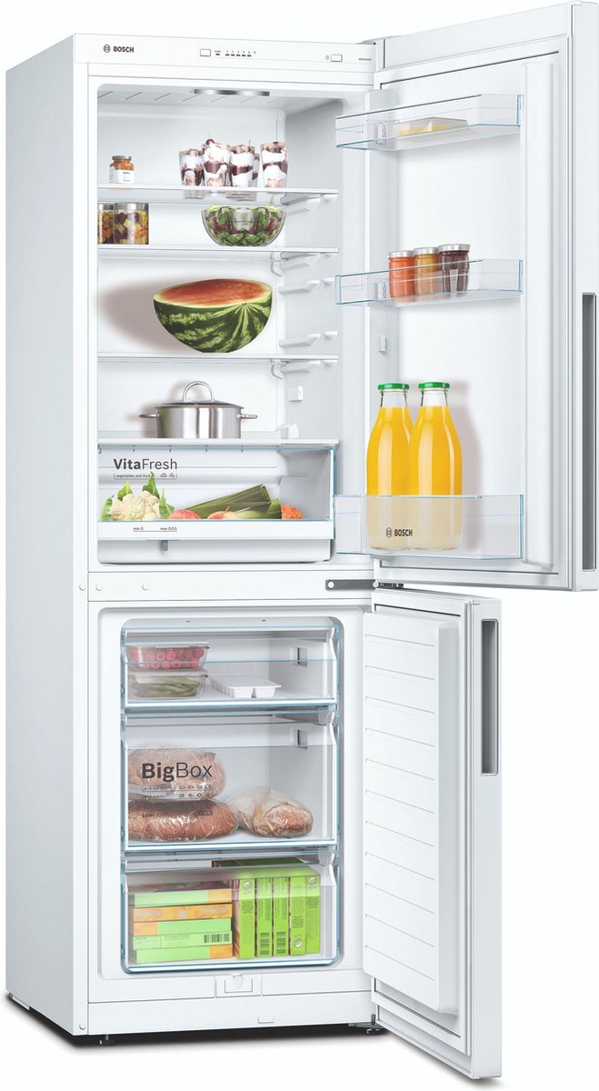 met de Bosch KGV332WEA koel-vriescombinatie, hoef je dankzij de easyAccess plateaus niet meer in de koelkast te duiken. Deze plateaus zijn uitschuifbaar, waardoor je gemakkelijk je producten kan bereiken. Met de LED verlichting heb je een helder overzicht in de koelkast. Bewaar grotere vrieswaren zoals een taart in de bigBox en groente en fruit in de VitaFresh lade voor een langere en betere versheid. Dankzij het LowFrost systeem hoeft de vriezer minder vaak ontdooid te worden. Hiermee bespaar je tijd en energie.