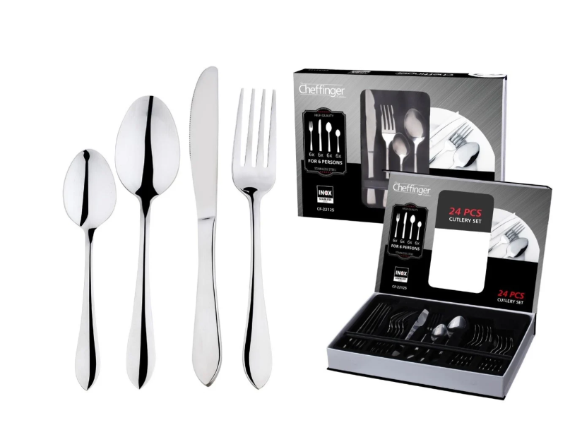 Deze Cheffinger bestekset is 24 delig en bevat vorken, messen theelepels, eetlepels. Ze zijn gemaakt van RVS, en heeft een mooie afwerking op de steel waardoor het een luxe uitstraling krijgt.