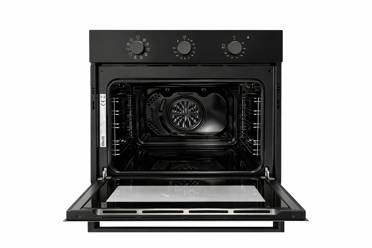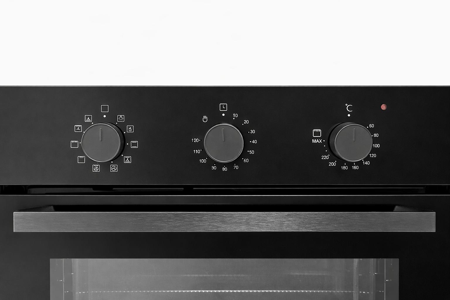 De oven heeft een stijlvol zwart glazen frontpaneel, waardoor hij perfect past in moderne keukens. De bediening is eenvoudig dankzij de mechanische draaiknoppen waarmee je gemakkelijk de gewenste functie, temperatuur en timer instelt.