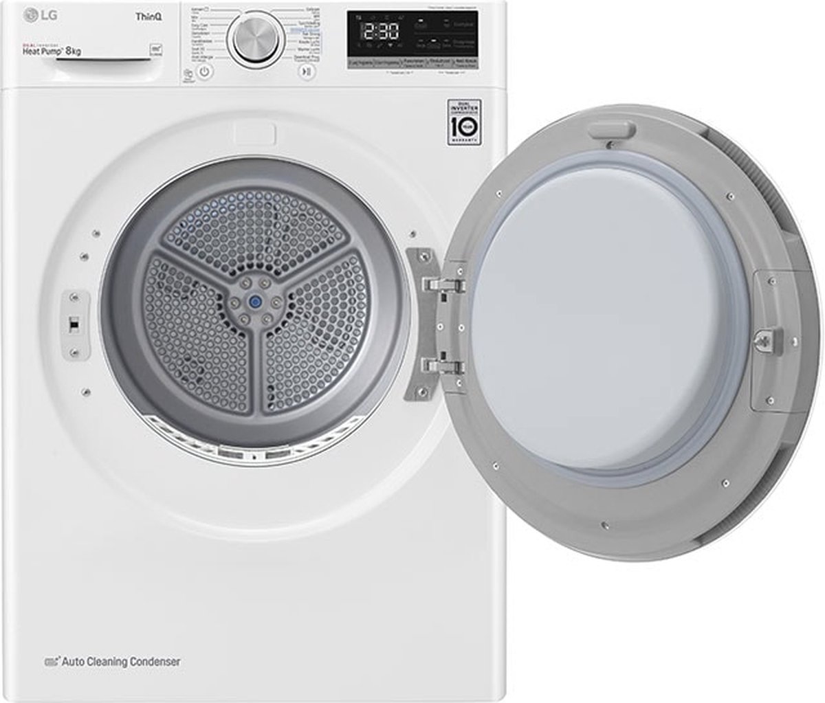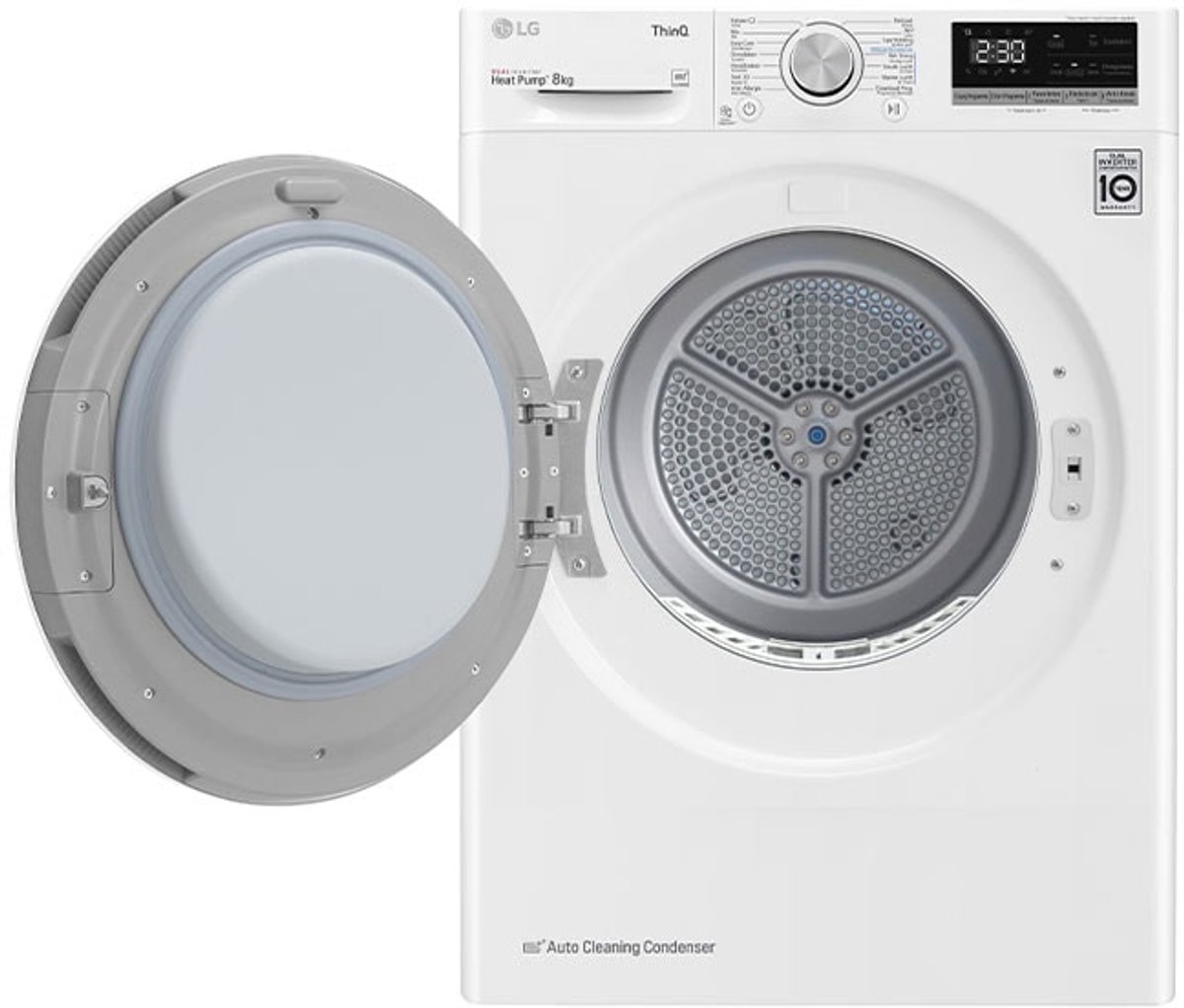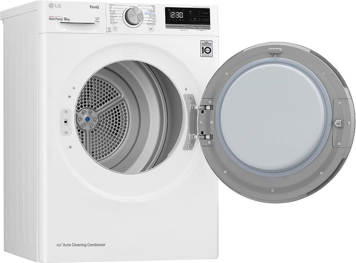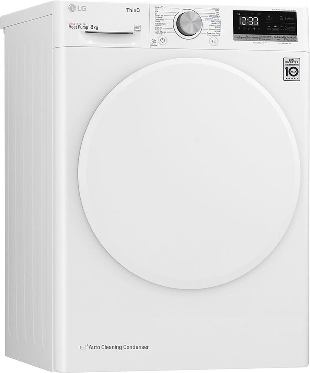 Drogen hoeft geen hoge energierekening op te leveren met de LG RH80V5AV0N-warmtepompdroger. Dit vrijstaande model wordt namelijk aangedreven door een krachtige DUAL Inverter Heat Pump. Deze heeft geen hitte-element nodig en heeft het vermogen om de snelheid van de motor aan te passen. Hierdoor gaat hij minder hard draaien wanneer een hoge snelheid niet nodig is. Het resultaat? Een zichtbare energiebesparing! Het is dan ook niet voor niets dat deze droger energielabel A++ heeft. Daarnaast hoef je de condensor niet langer zelf te reinigen, want dit gebeurt minimaal 3 keer per programma volledig automatisch. Zo blijf jij zorgeloos genieten van uitstekende prestaties. En met 14 droogprogramma’s en een vulgewicht van 8 kilo werk jij de stapel wasgoed op efficiënte wijze weg. Wil je nog meer uit je LG-droger halen? Koppel hem dan met de ThinQ-app voor extra programma’s, automatische selectie van geschikte droogcycli, en meer.