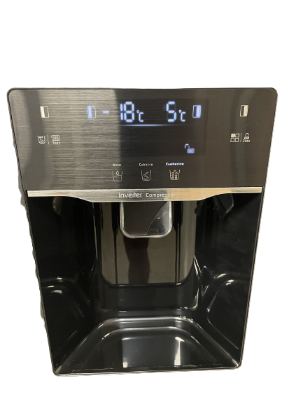 De koelkast is gemakkelijk te bedienen via het display op de linkerdeur, waar je ook de temperaturen in zowel het koel- als het vriesgedeelte kunt aflezen. Onderaan het display bevindt zich de ijsblokjesmaker/waterkoeler met tap, die is aangesloten op een vaste wateraansluiting.