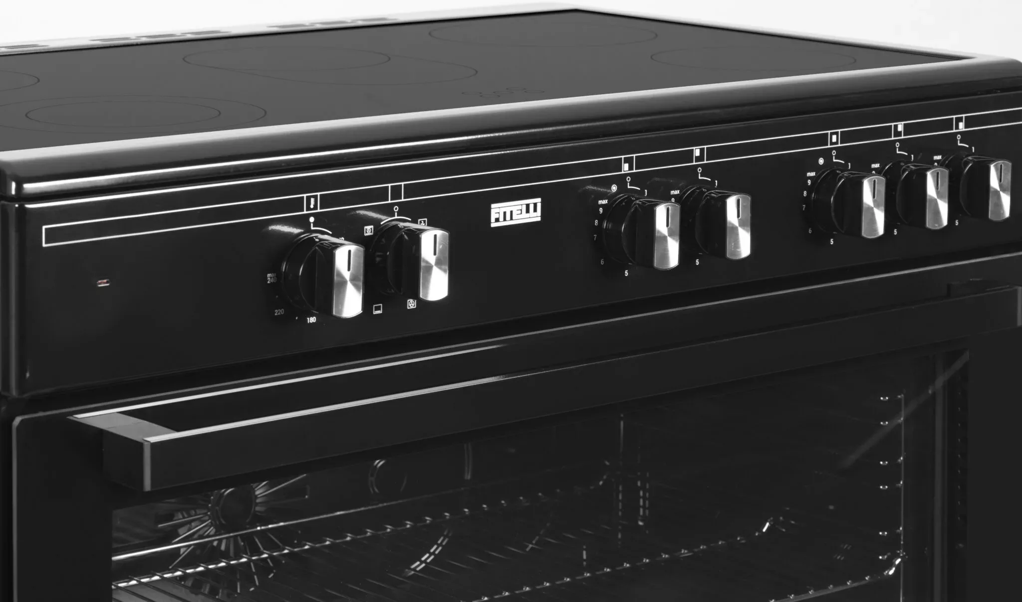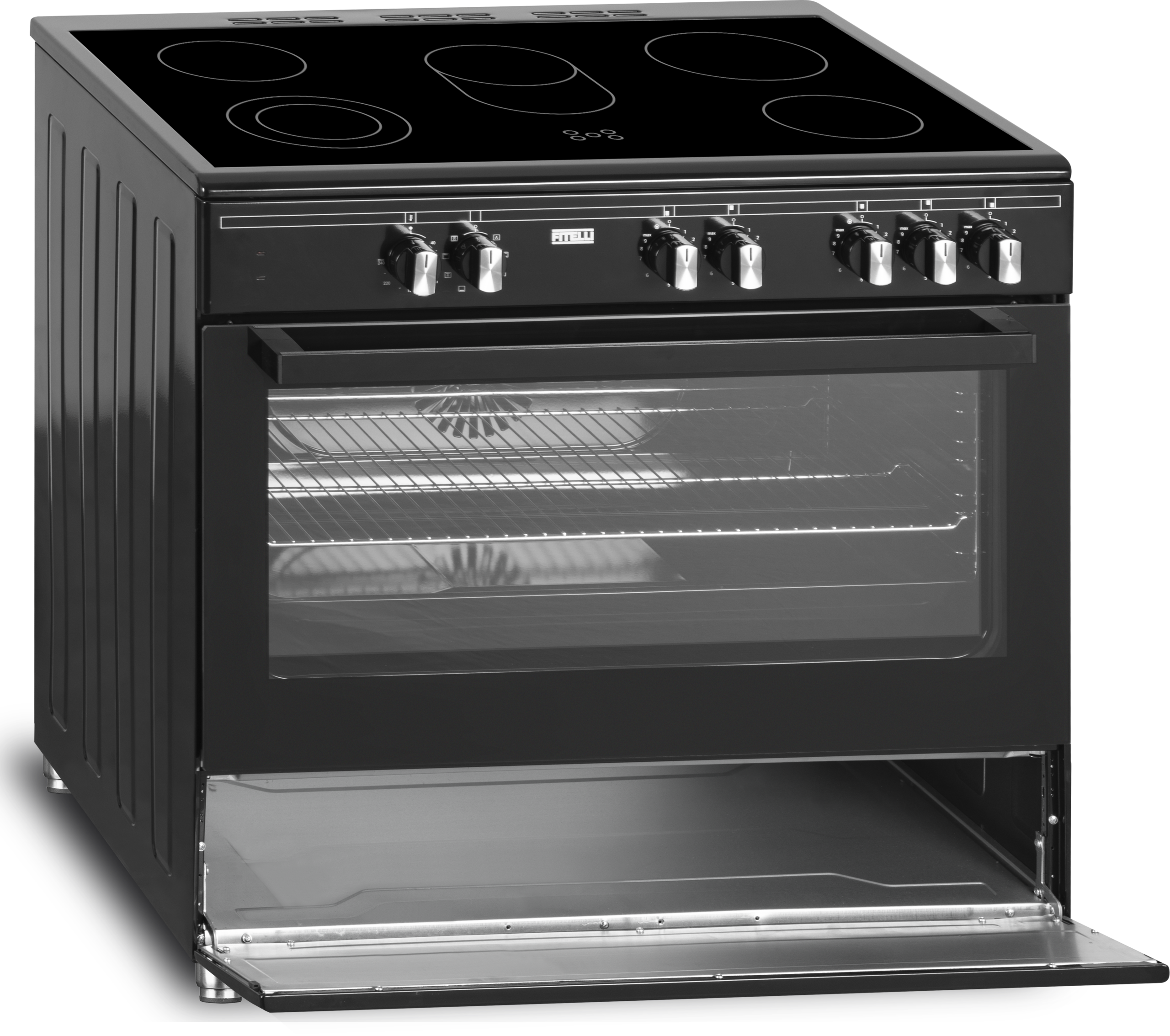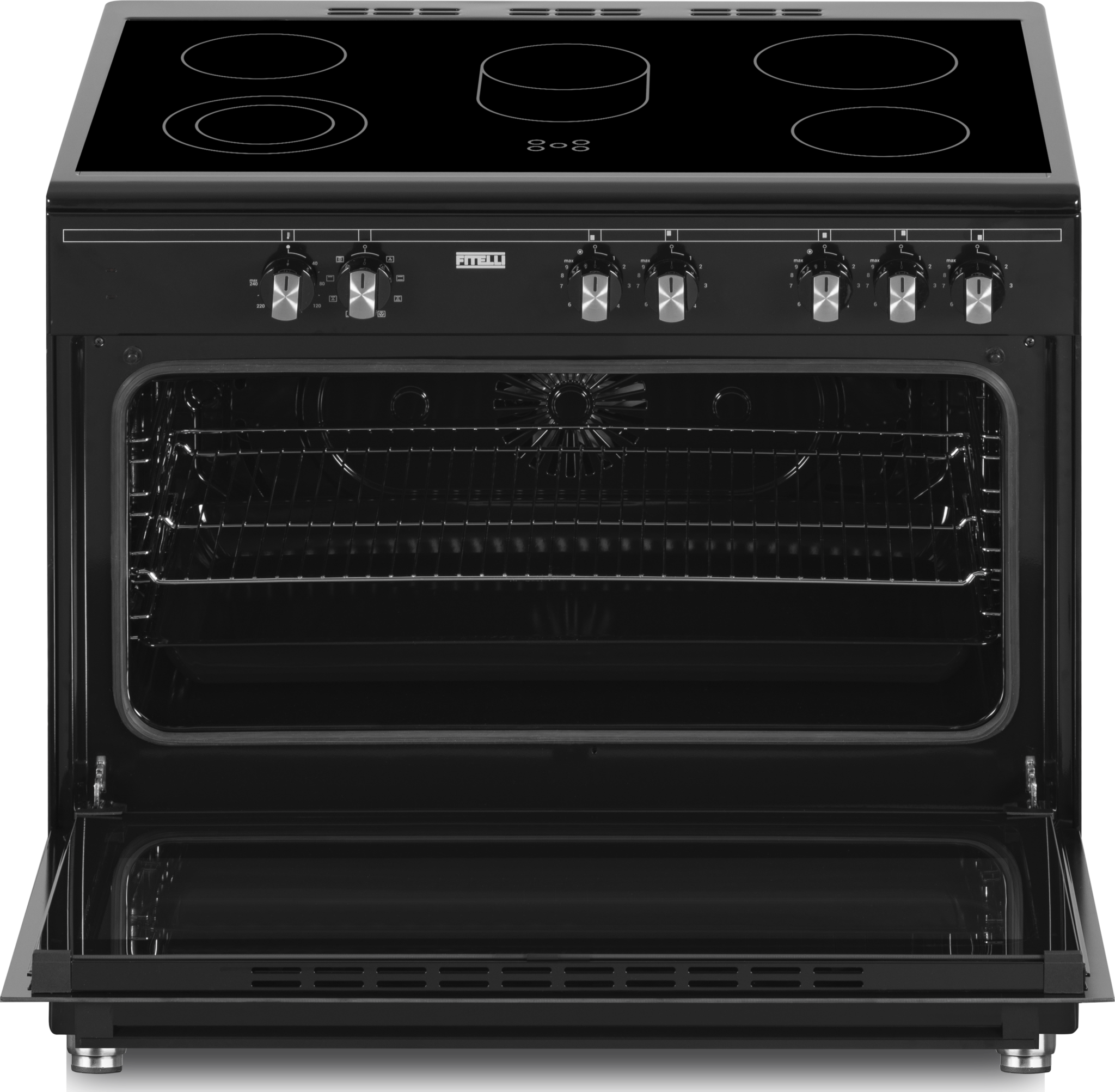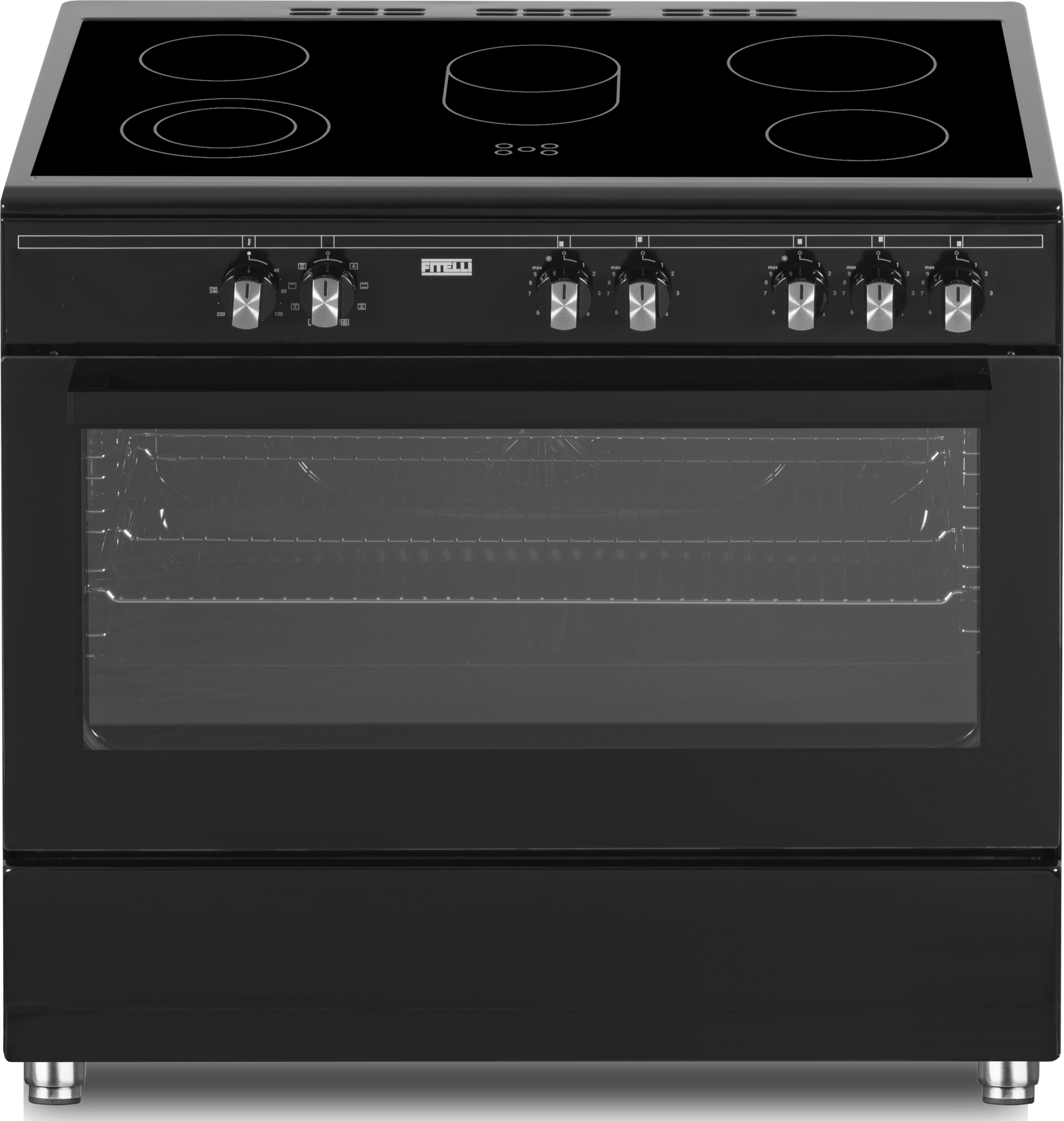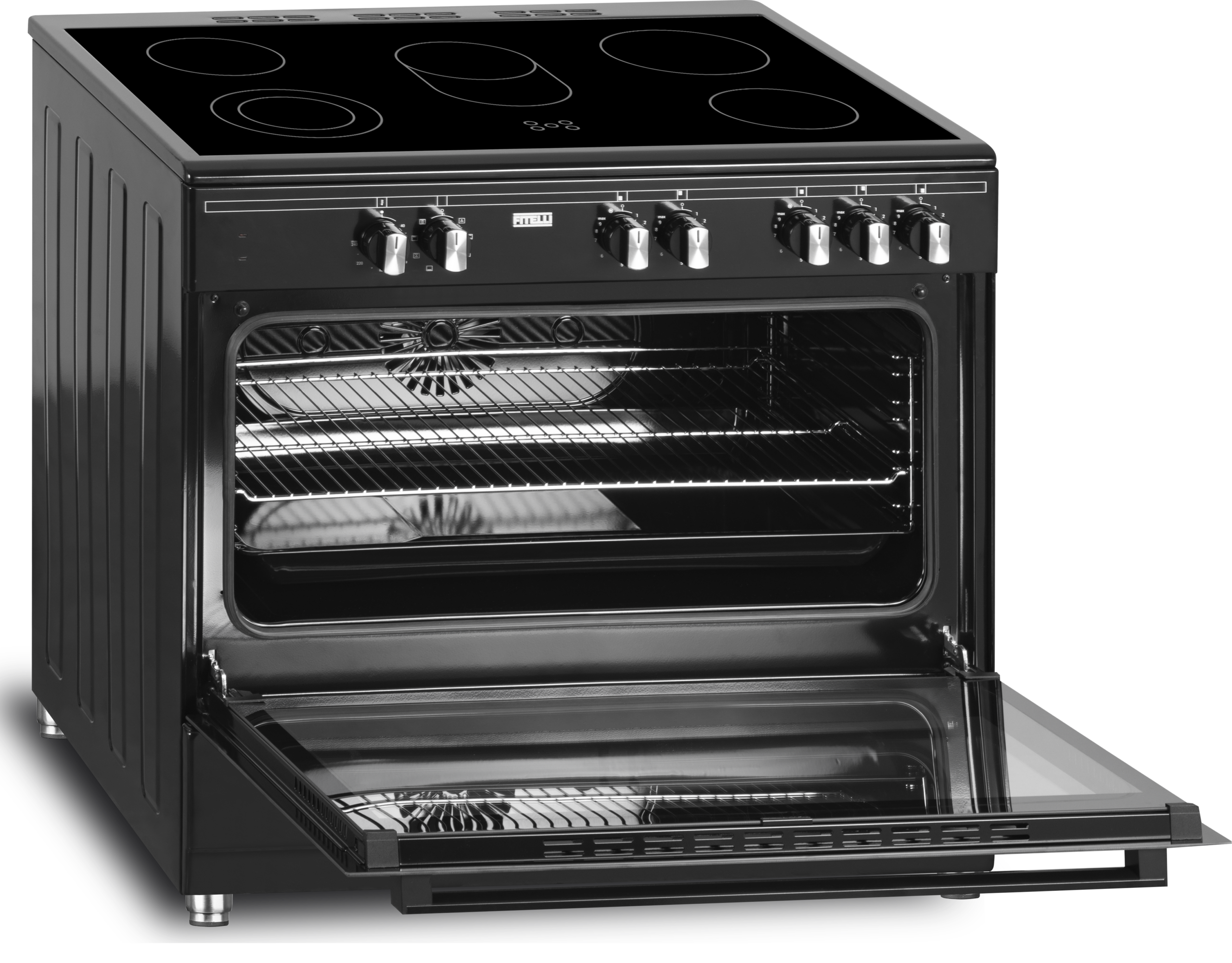 De fraaie Fitelli FK9001ZW beschikt over 5 kookzones en een heteluchtoven. Of je nu een heerlijke taart wilt bakken, een stuk vlees wilt roosteren of lekker low en slow een stoofpotje wilt maken, voor de FK9001ZW is dat allemaal geen enkel probleem. De bediening werkt heel eenvoudig door middel van draaiknoppen aan de voorzijde. De keramische kookplaat is eenvoudig schoon te houden. De FK9001ZW heeft een multifunctioneel ovensysteem: onder- en bovenwarmte hetelucht circulatie en grill. In de oven heb je de beschikking over ovenverlichting en een min-max oventemperatuur 40-240ºC. De oven heeft een inhoud van maar liefst 95 liter, genoeg dus voor een heerlijke pizza of eigengemaakte ovenschotel.