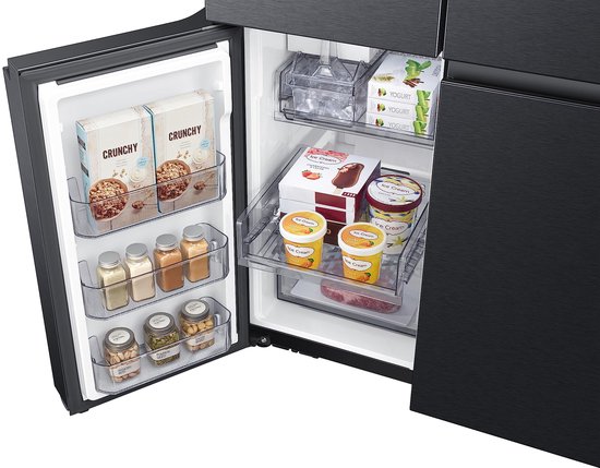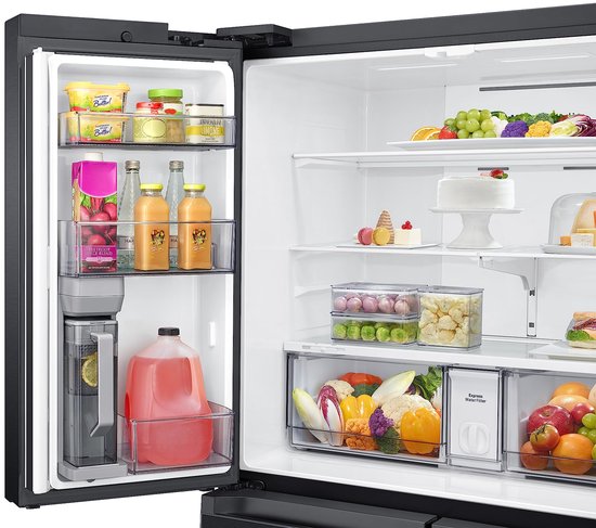 De Amerikaanse koelkast van Samsung beschikt over een totale netto inhoud van 431 liter. 100 liter vriesruimte en 331 liter koelruimte. Dit is goed voor twee boodschappenwagens vol producten. Omdat de breedte van de amerikaanse koelkast maar 82 cm is, past hij is vele keukens.